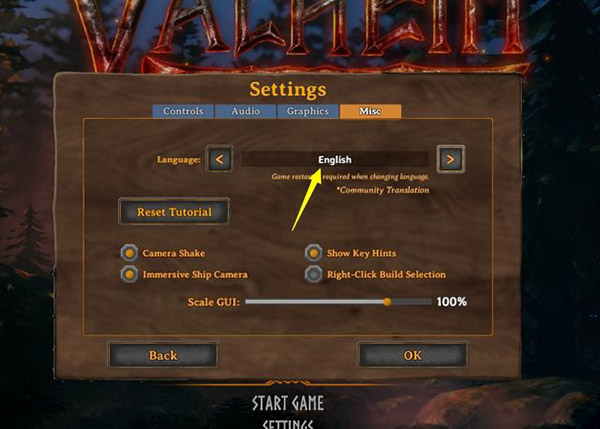 4、在Misc选项下,Language栏可选择语言,English往左调3个就是中文;