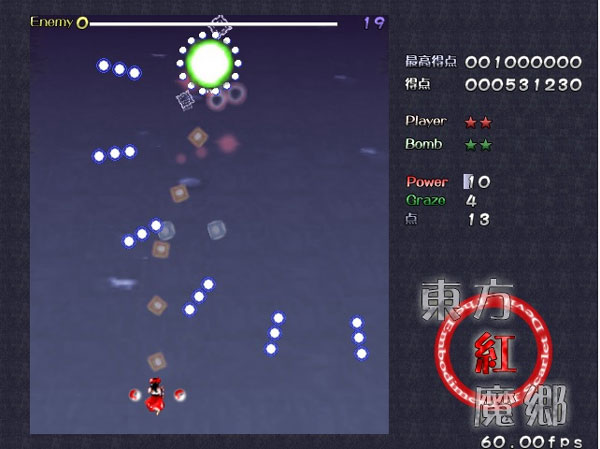 除击中判定外,自机周围还有一个“擦弹判定”。若敌方弹幕的有效范围在擦弹判定之内,将使“Graze”的点数增加,同时可增加得分。