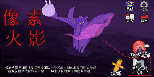 像素火影电脑版是由U鼬神及其开发团队出于兴趣自制的非盈利同人游戏。是专门为电脑玩家推出的版本,在像素火影电脑版中,内置演练、无尽试炼、忍术对战三种模式玩法,玩家可以根据的喜爱进行游玩,并在其中附带大量原著漫画彩蛋哦!