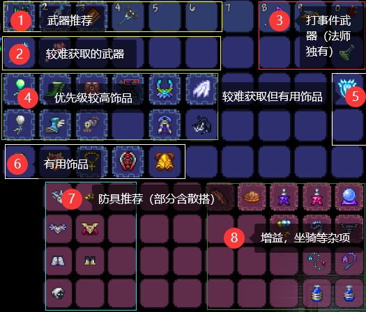 这里总共为玩家分了8类,它们分别是:推荐武器、较难获取的武器、打事件武器(法师独有) 、优先级较高饰品、较难获取但有用饰品、有用饰品、防具推荐(部分含散搭)、增益坐骑等杂项。接下来具体分析。