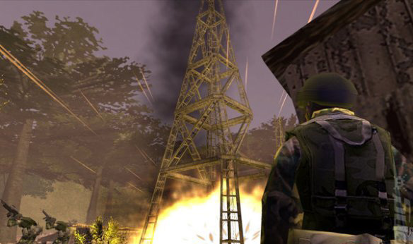 游戏中的光影特效,其中以哥伦比亚的茂密丛林和泛着波光的河道最是逼真,身处直升机下俯瞰九曲十三弯的河道和浸沉在雾霭中墨绿色的山峦。爆炸场面:飞机的底部脱落,机身解体,接着在空中爆成碎片。配乐一时低沉,一时高扬,完全投入眼前不是你死就是我亡的浴血战中,当玩家用M16击中装甲运输车的时候,车子会燃烧,火光中浓烟滚滚。