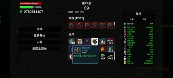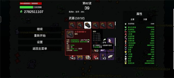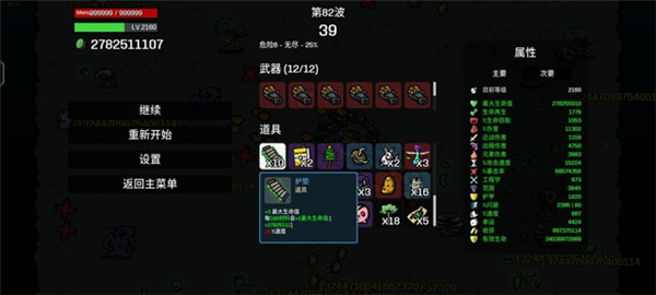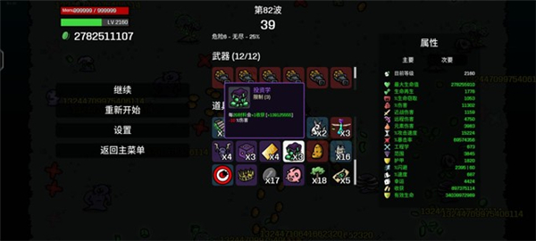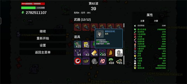 5、土豆发射器、土豆发射器的伤害是20%远程伤害和20%生命值加成、在前面几个道具加持下生命值已经十分恐怖、和伤害加成叠加、再高暴击伤害下、秒杀所有怪物!我目前还只打80关伤害就过一亿亿了。