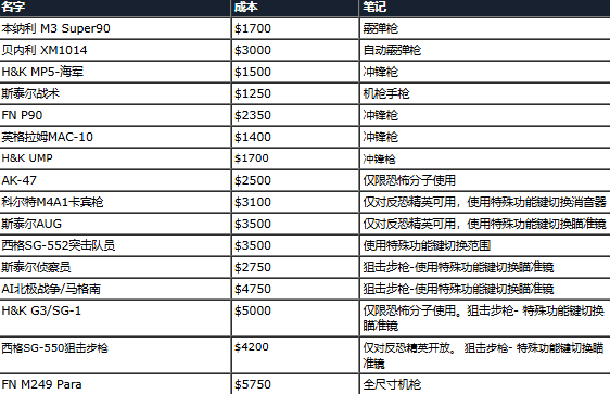 武器分为三类:主武器 (步枪、霰弹枪、冲锋枪和机枪)、副武器 (手枪)和近战武器(刀),手榴弹和拆弹工具也有其自己的类别。