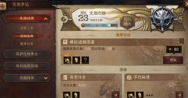 1、首先每天要做这个先祖试炼的任务,这个是快速升级的关键,简单方便。优先做推荐活动,双倍奖励。刷副本较慢,且比较费力,我建议选择悬赏任务,简单,快速,而且可以爆怪物精华,解锁图鉴领东西,同时赫拉迪姆图鉴给的印记是最多的。够肝的话几天就能满级,满级后每天刷一刷基本上也能一天升一到两个巅峰等级。如果要刷副本的话,推荐刷纳马力神庙。这个副本给的先祖印记多,并且路线相对简单,不用来回到处跑图,最主要的是这个副本的boss比较多,爆出传奇宝物的概率相对来说高一些。然后里面的其它任务也可以过一过,领一些可以兑换别的物品的东西,像荣誉什么的。
