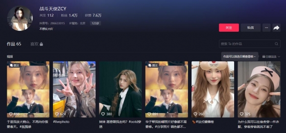 4、抖音名字叫战斗天使zcy,抖音号为286633015。