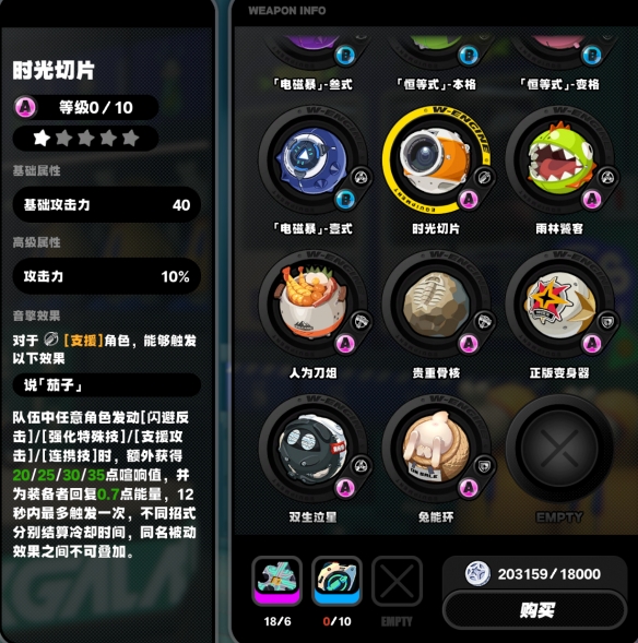 2、A级音擎时光切片,音擎就是代理人使用的武器,时光切片是一把4星支援类武器,支援角色可用,加快大招进程+回能,非常通用,虽然是可肝的,但是开服前期资源紧缺,短期也不太好肝,能提前拿到还是非常不错的,建议优先获取。