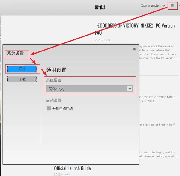 在启动游戏页面,点击右上角的三条杠,进入系统设置,找到通用-语言,选择“简体中文”就可以将游戏语言设置成中文了。