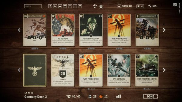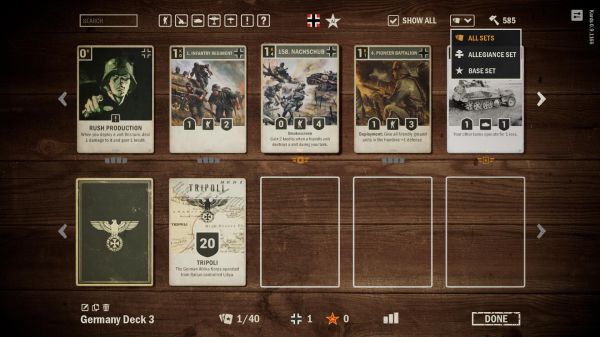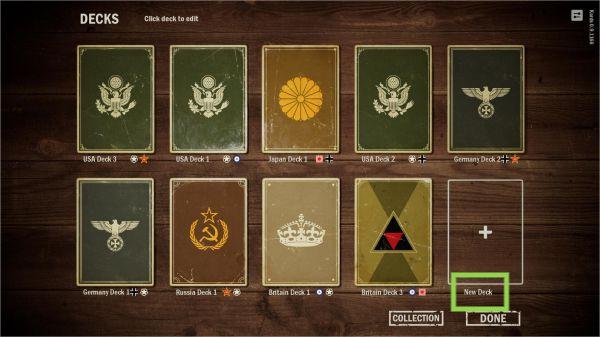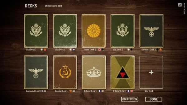 你需要从二战中的五个主要阵营中选择一个来打造自己的卡组并与其他玩家进行对抗。每个卡组都可添加一个盟国,你可以从盟国获得支援,进而取得战略上的优势。