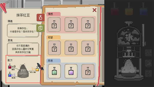 梦之刨冰游戏中,玩家需要利用三种不同的糖浆,根据放入的类型以及数量来制作不同口味的刨冰,其中红色代表情感、黄色代表欲望、蓝色代表思想,玩家需要通过制作不同的刨冰来与客人建立起联系,知晓他们背后的故事,并且获得新刨冰的配方。
