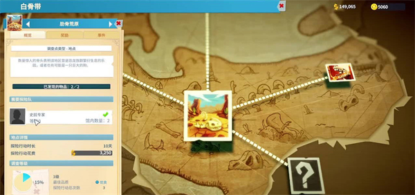 8、玩家选择出发探险的地图,不同的地图会有不同的要求,与此同时每一次探险都会增加地图熟练度,熟练度越高带回来的藏品就会越珍稀。有的地图会对探险的专家有相应的能力要求,可以修建员工培训室来提升,也可以在员工招聘面板里面筛选有相应能力的专家。