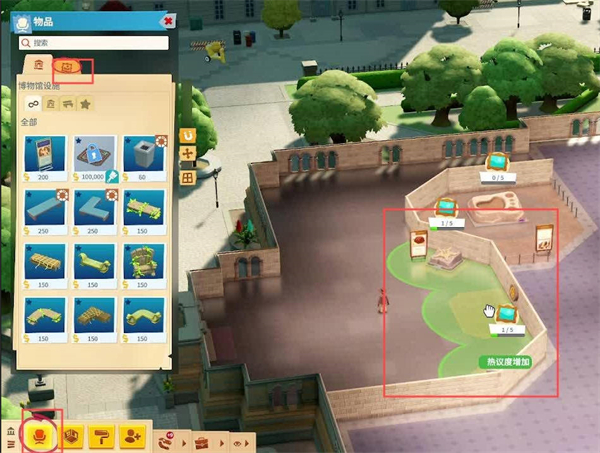 4、展品展出之后玩家需要对展览品进行装饰,需要利用较少的装饰品尽可能的覆盖更多的展览品,同时还要预留出介绍版和垃圾桶募捐箱等等物品的位置。