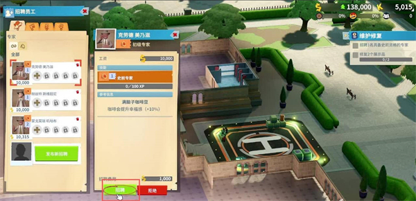 3、之后需要招募合适数量的员工从勤杂工、专家、助理、保安都在这一区域,成功招募好之后可以直接拖拽放置到博物馆。点击员工可以查看员工的薪资满意度忠诚度等等。也可以管理员工选择是否解雇等等。