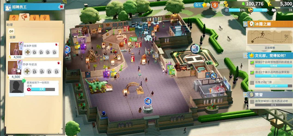 1、在游戏的一开始推荐玩家先从剧情模式开始游玩,剧情模式下有详细的指引相当于一个新手教程。刚开始玩家会接受到一个空白的博物馆,玩家需要招收员工、布置展览品提升博物馆的热议度吸引游客过来参观。