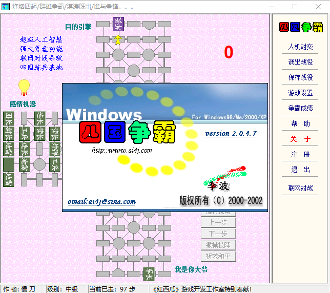 11.网战和任何时候,您可以通过以下方式退出网战,(三次延时、调出战役、人机对奕、退出),当然可能还有其它方式也行,如拔掉网线,机器断电。。。,这里就不一一列举了。