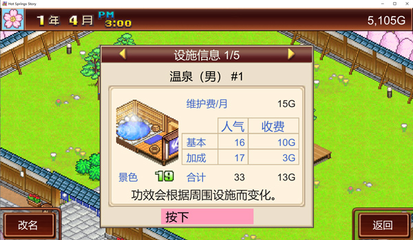 温泉物语电脑版(Hot Springs Story)是一款由开罗游戏(Kairosoft)开发的像素风模拟经营游戏,玩家将扮演温泉旅馆的经营者,从接手一家陈旧的日式旅馆开始,通过精心规划温泉浴池、餐厅、娱乐设施及日式庭院的布局,吸引游客并提升满意度,以便于更好的经营温泉旅馆。游戏中,玩家需要研究不同温泉配方,比如如硫磺泉、碳酸泉,并种植梅树与八仙花等植物增强环境效果,还要合理安排温泉、餐馆、商城等各种设施的位置,应对50多种客户层的个性化需求,争夺“全国第一温泉”称号!