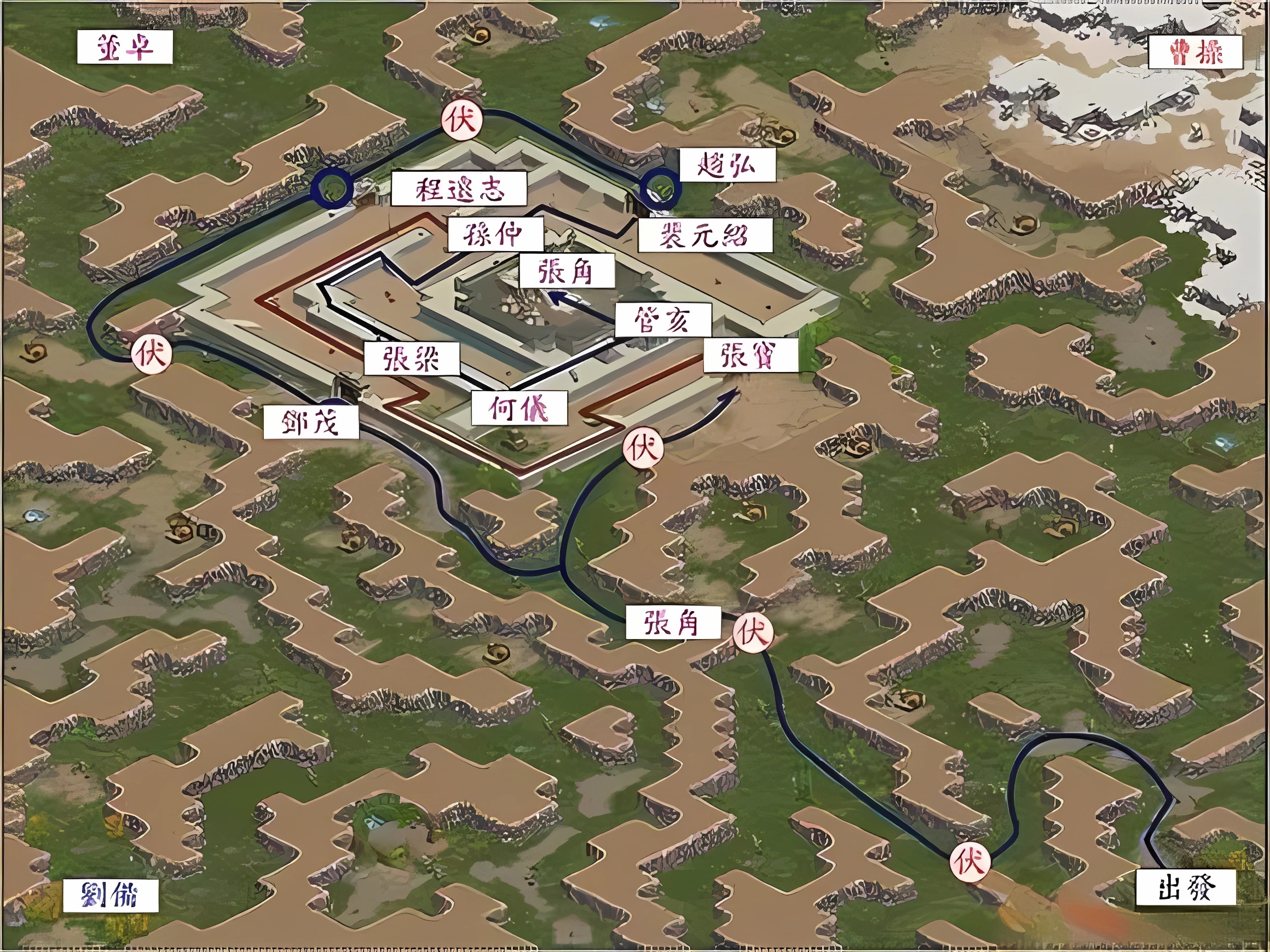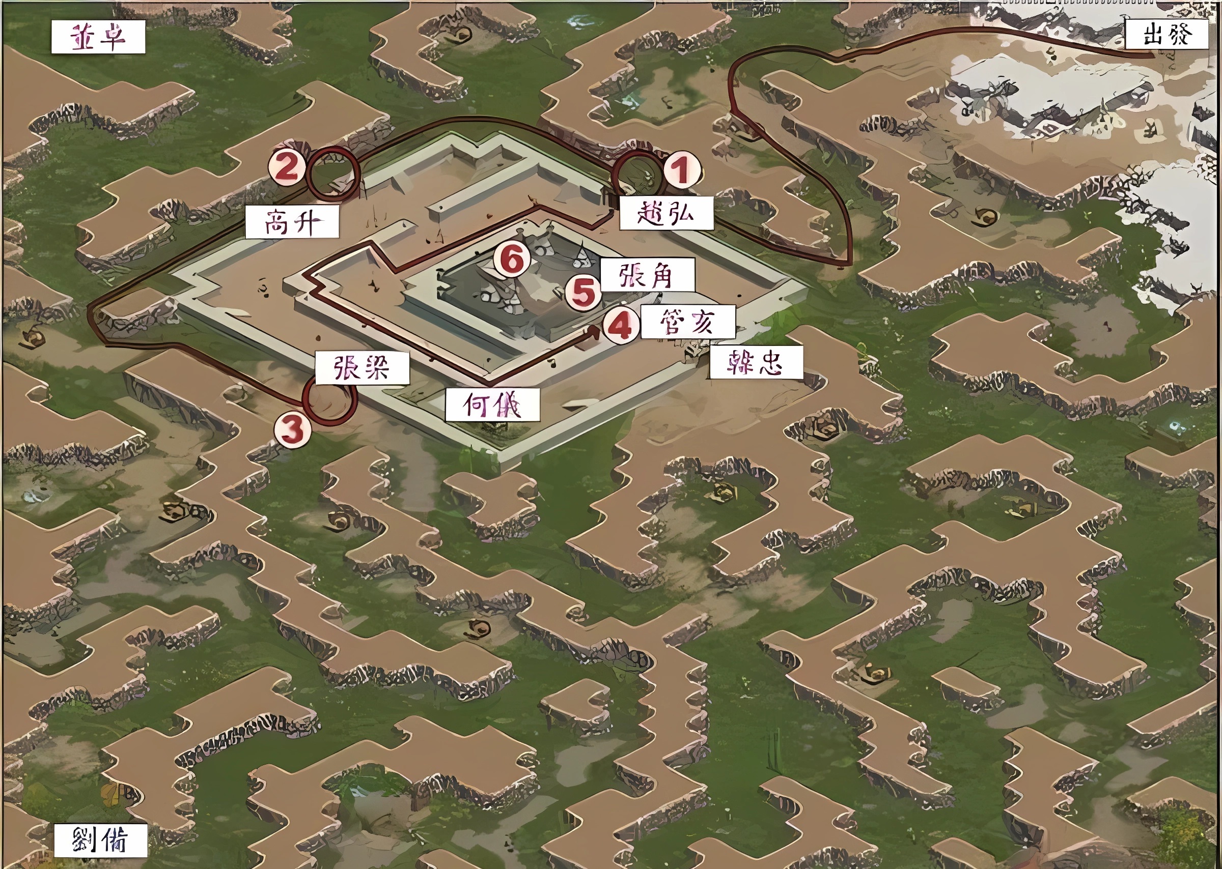 攻略顺序:从出发地点往上走,转左再转下,可以碰见第一次伏兵。将伏兵解决后往左上走,在此处有第二次伏兵。此次伏兵一定要解决,因为之后就是张角。把张角击退之后,往左上进兵,然后转上到和守门将军韩忠交战。杀死韩忠之后观察目前的战场状况,如果刘备退兵,表示要到左下门去打邓茂,曹操退,表示要去右上门打赵弘,这些战场状况都要注意,反正不管如何,一定要将四门守将击退,之后门才会开,进入城中。如果你从韩忠处进门,会碰到张宝,将其打退之后,往左上城楼,然后下来可以打张梁,如果张梁被击退,表示已经有人先冲入了!立刻往上转右,然后转下来从右边城楼上去,之后往下走,可以打到何仪。何仪打完是管亥,之后才是张角。如果张角变化成白虎精,则可立刻涌上杀之,大量放技换血,打完此妖,本关过矣!