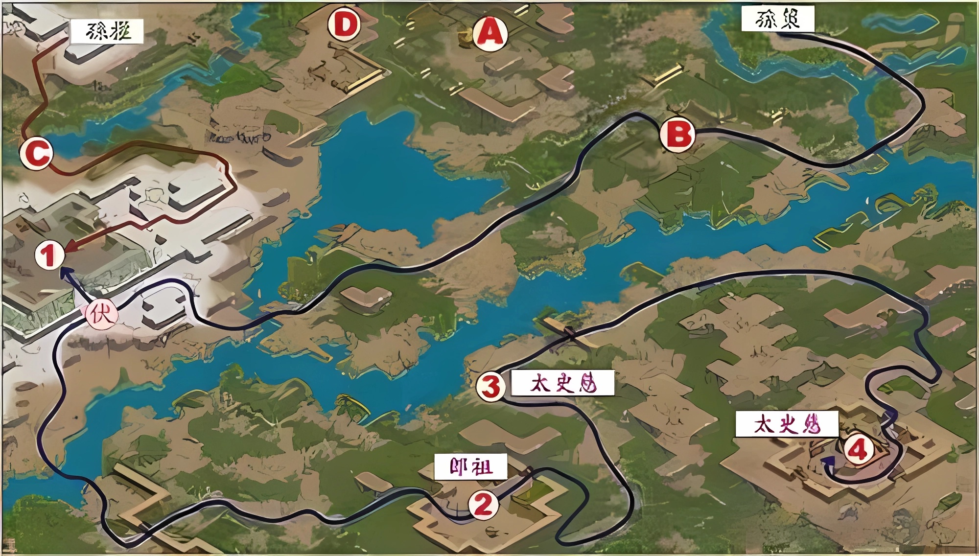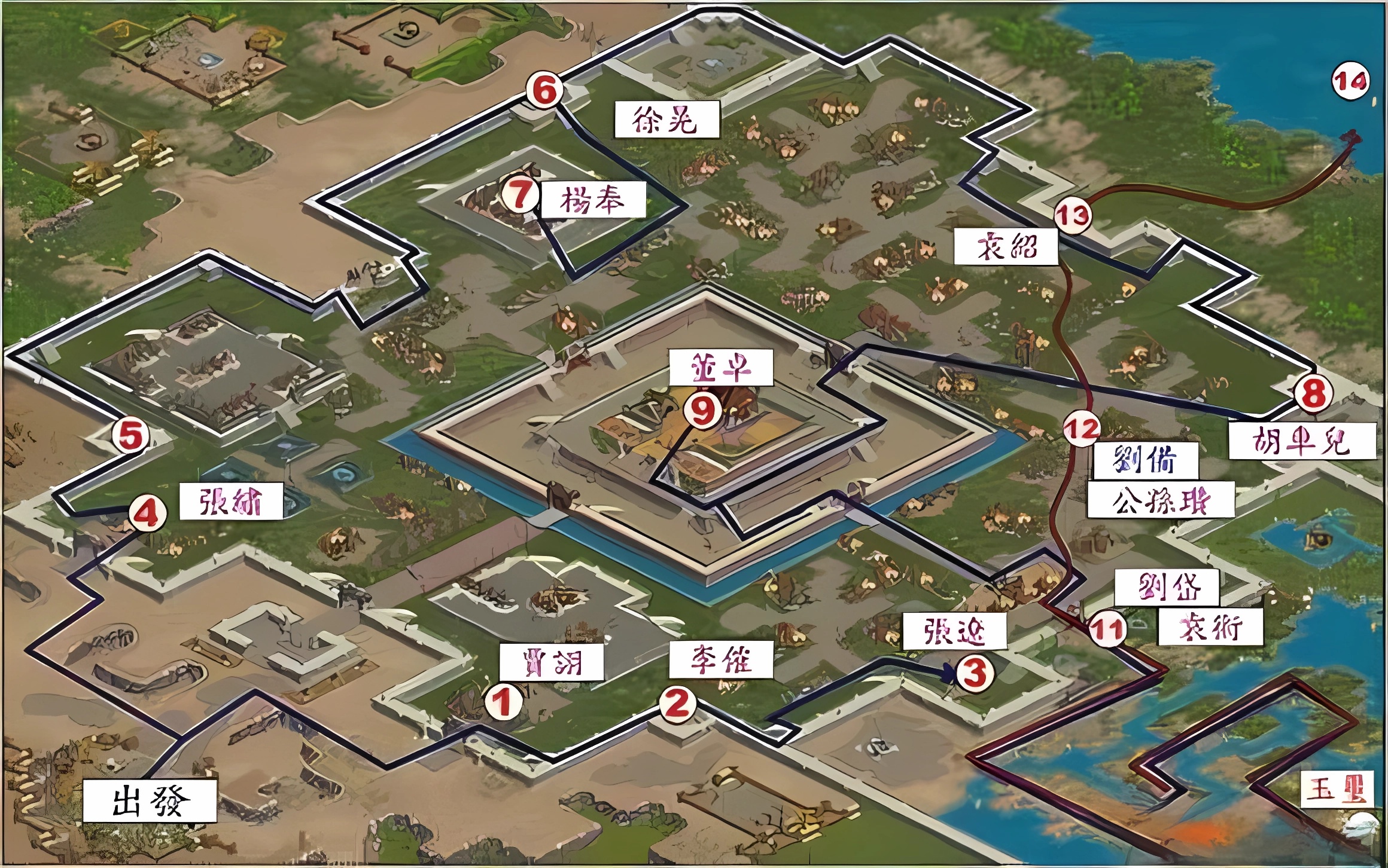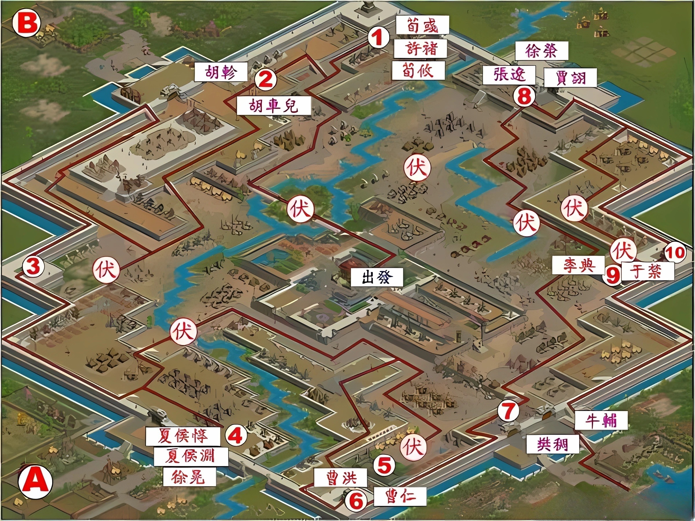 攻略顺序:进入本关之后,你只有四个人;首先,先去占领村庄。不管你打算占领的是哪几个村庄,一定的时间之后,太史慈就会死掉。太史慈死掉之后,军寨部分就会出现孙权的大军,之后就会改变战略,要全力反攻曹操。首先先将外面的武将撤回本阵,然后进行一下恢复和补给。接着派遣武将出去到(军寨左右,守住此两处,军寨就不会受到袭击。然后从寨本部将部队分为两股,在左侧遇上于禁和曹仁会拦路,最后在左上与李典、夏侯敦作战,打完徐晃之后原地暂留,换另外一部动作。另一队从右出发,沿路打下五处兵哨,之后碰上曹洪、庞德,将其引开后各个击破。之后打下曹丕和甄姬。过桥之后可以打到曹彰与贾诩,打完以后两队合击中间的张辽及乐进。之后往上入城,在城中击败荀攸、许褚、曹操,这关结束。
