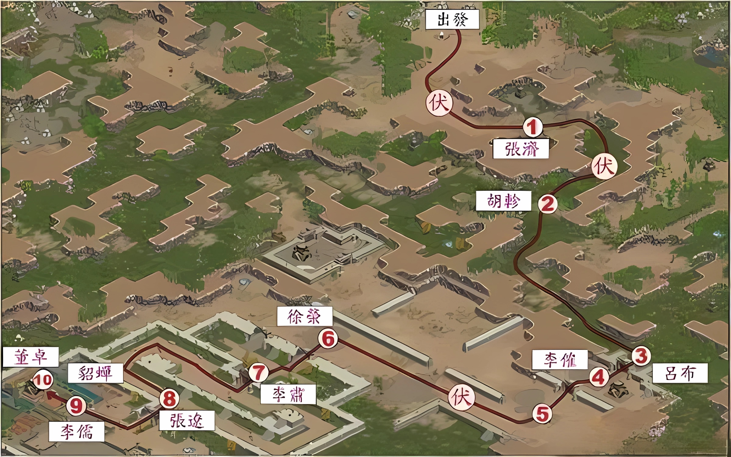 攻略顺序:一开始你是位于地图的中央上方的位置。往下走转右下,碰上张济,将其击败之后,直接向下转弯,往下可以看见胡轸,小心一点击败他之后,在这个十字路口稍等刘备。看见刘备后与他合流,往右下走去打吕布。让刘备的人先上,然后看见吕布被吸引冲过来之后再上去攻击,打死吕布之后攻击关门,然后与李傕作战,敲开之后的门。再往左上走,徐荣会在此候教,将其击败之后,往城内,打败李肃进入内城,往左上绕下来,这时候建议你等待队友,如果袁绍等人顺利敲开汜水关,就可以在这边等他。如果有人先碰了张辽,便可以一气上去拼杀,将张辽打退之后往城内走,先去打李儒,用围殴的一下子就可打死;但是要千万小心董卓自己的攻击力,栽在一片混战的状况之下,最好还是要小心为上。