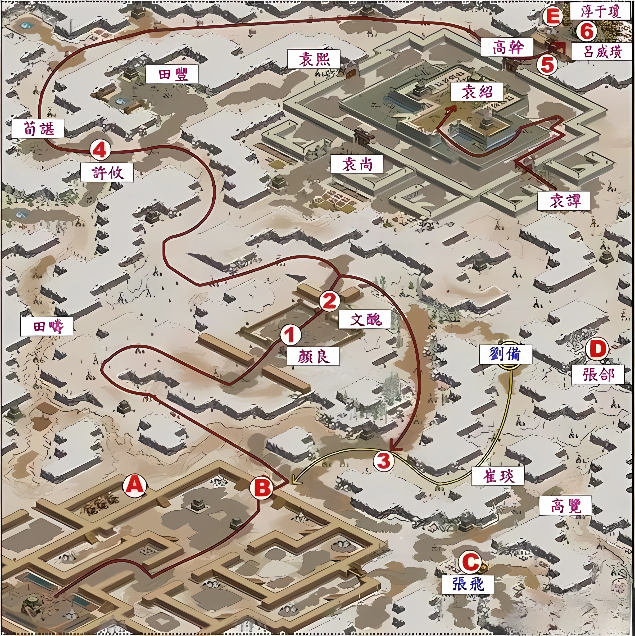 攻略顺序:首先要先注意我军粮仓的所在地,一开始先往上走,去砍颜良。打倒颜良之后,将文丑斩死,刘备便会出现,打完刘备之后,郭嘉会出现猛咳的状况,如果找不到神医华佗来诊治,他就会离去了!接着找许攸,由他提供乌巢的情报,一路帮助他前往乌巢。在此之时要派遣另外一小队前往张合处,不需要打张合,他就会因为讨厌袁绍而加入我方,这时候还不要对袁兵的兵哨站下手,等到许攸到了叫开门,然后一路人杀入将粮仓击溃,就可以让所有兵哨站撤兵了。但是要小心里面有两名将领,一名淳于琼,一名吕威璜,都不算弱。乌巢击破之后,将另外三门攻下,分别是袁谭、袁尚和袁熙。将此三门击破之后,城门就开了,最后再进入打倒袁绍,则此关可破!