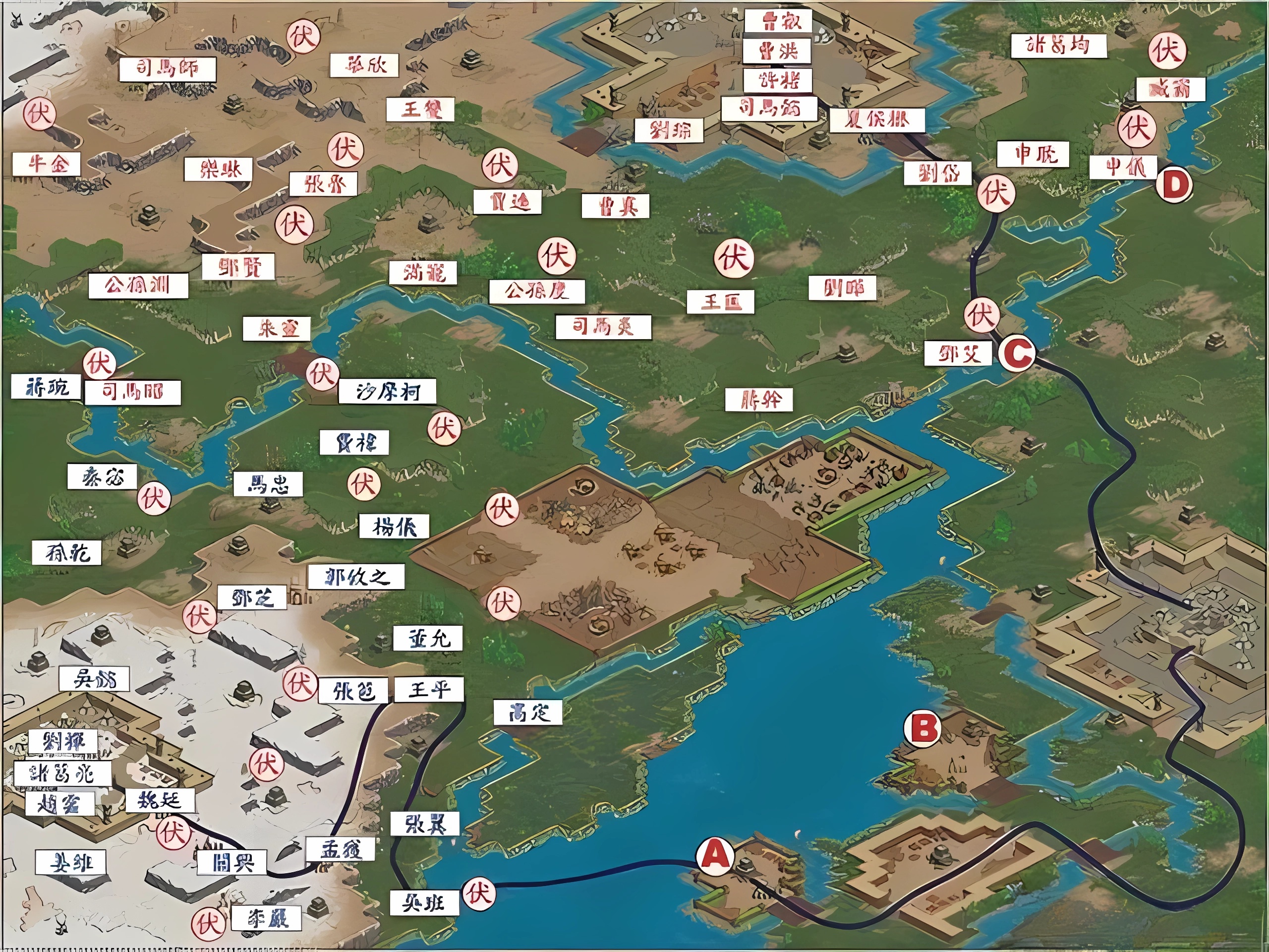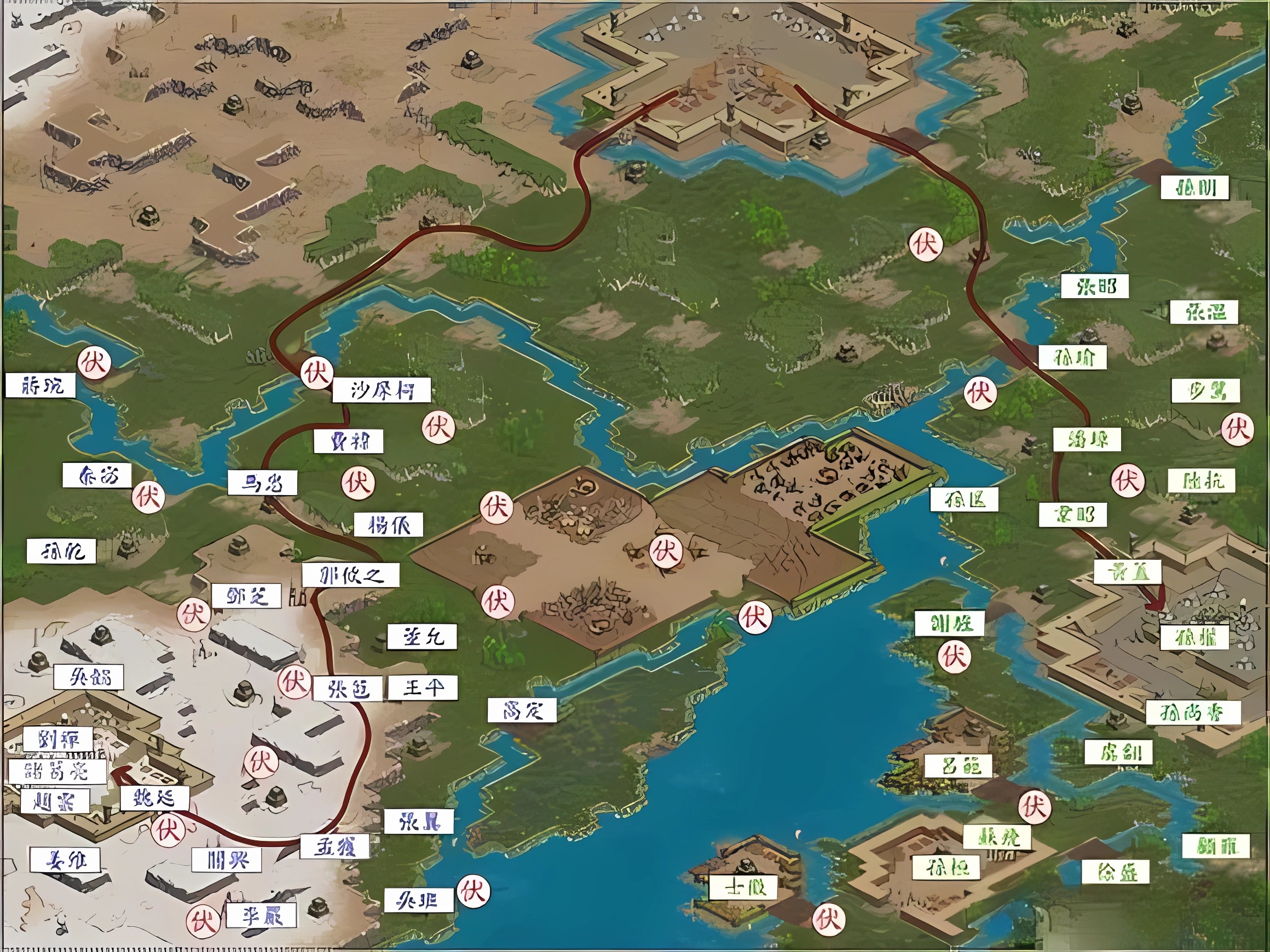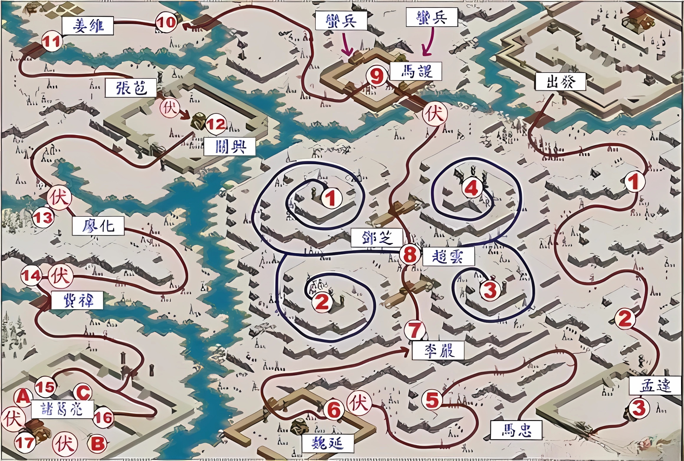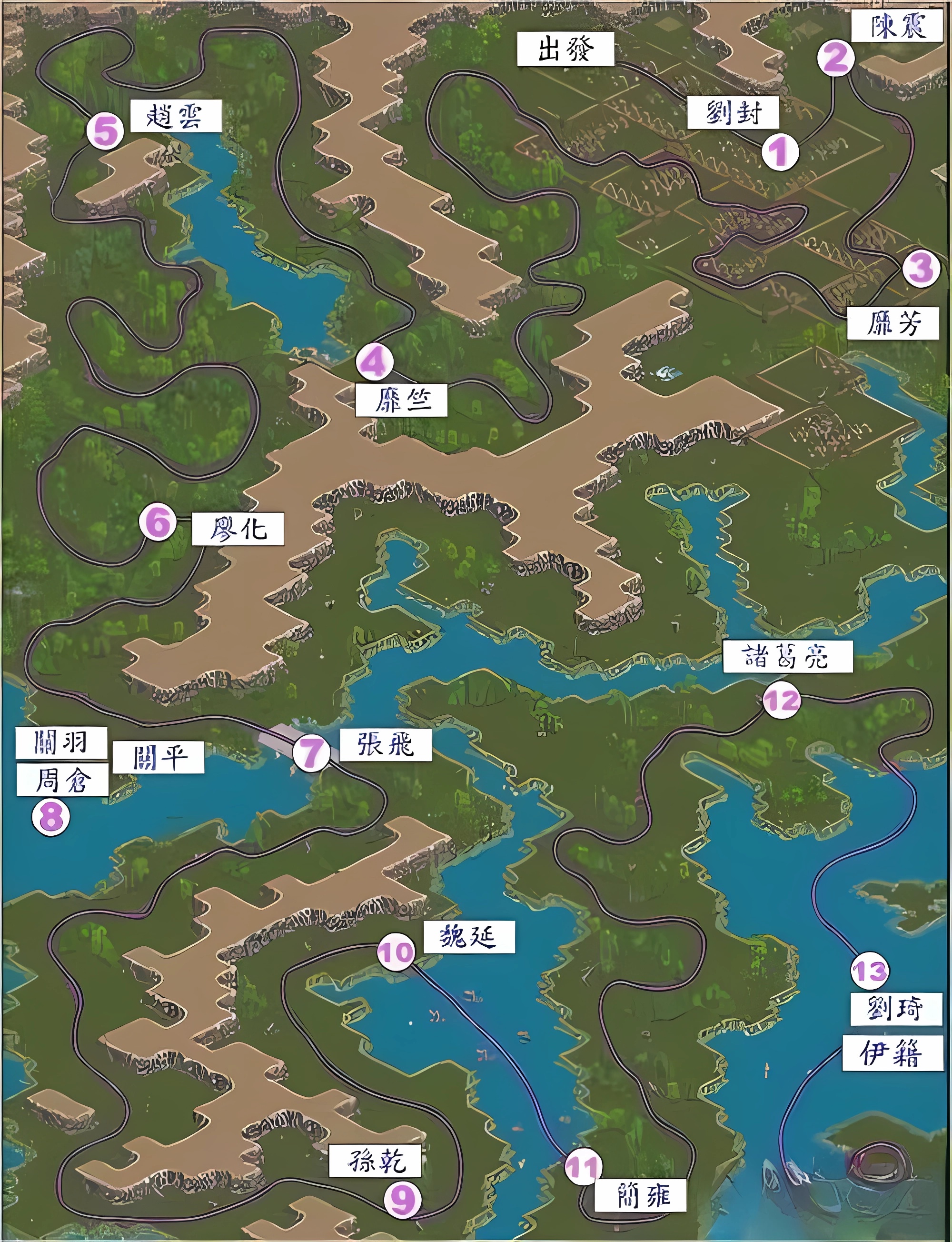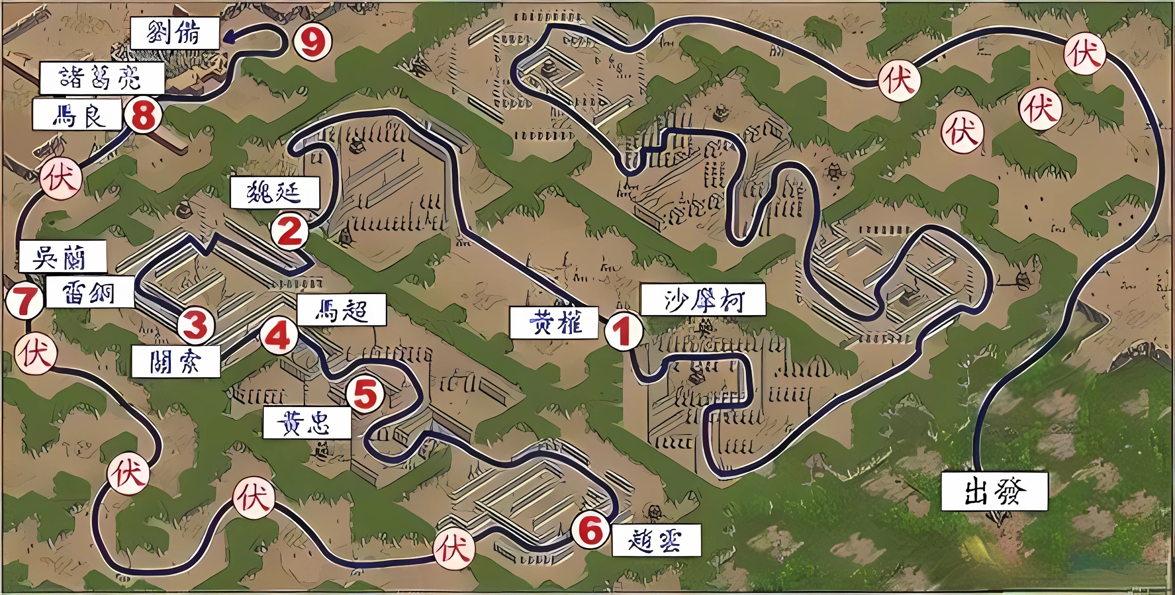 攻略顺序:从出发点向上一直上去,沿着最右边的路一直上到最上方,左转之后可以碰见伏兵。穿过两次伏兵之后,可以抵达八阵图。过了前面三个阵之后,往上转上来,会碰见黄权和沙摩诃。建议之前的兵哨根本就不要打,将物资多留一些下来之后使用。打完黄权与沙摩诃之后直接向左上穿过中央阵,然后避开兵哨站,直扑魏延。将魏延打挂之后,连续将关索打败,而后稍事恢复,派一将前去将马超引来,然后擒杀。马超打掉之后,往下走可战黄忠,唯独赵云在的兵哨前,最好不要让他与兵哨战的火力连通。将这些将领都打完之后走出八阵图,连续穿过三次伏兵,最后可以碰上吴兰与雷铜。再往上通过一次伏兵,可以打到诸葛亮和马良。打倒之后,擒杀刘备大获全胜!