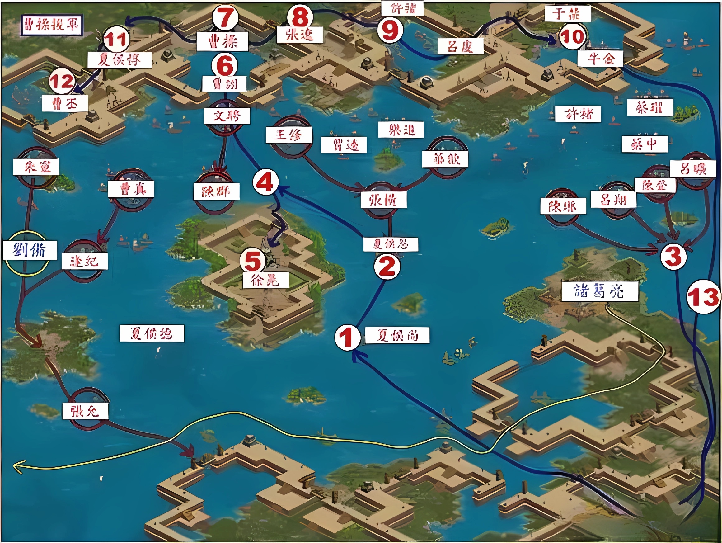 攻略顺序:不需要去占领中央的盗贼区域,只需要慢慢的先攻打魏国。魏国的主城离我军本阵较近,可以远交近攻。出发之前先守住两处的兵哨和港口,断绝蜀国的骚扰,然后派兵将两桥守住,顺着路线前往魏国。按路往上走,直冲到曹睿处,在那之前需要将邓艾、刘岱、夏侯茂的小队击退,最重要是城中还有许褚、司马懿、曹洪与曹丕。先打掉门外的兵哨站,然后派人快速冲入后将敌军引出,将曹睿完全击杀。接下来是蜀国。攻打蜀国需走水路。下水之后,从左下方的码头上岸。打岸边的吴班之前会碰上伏兵,将伏兵解决之后,一路上打倒张翼、王平、张苞、孟获、关兴、魏延,闯入蜀国大营。用弓箭手密集对付箭塔,之后才派人冲入该处,城内有诸葛亮、刘禅、赵云等人在其中,只要将其全部杀死,蜀国也就等于灭亡了!将曹魏和蜀汉的武将全部打死,这关就算过关了喔!