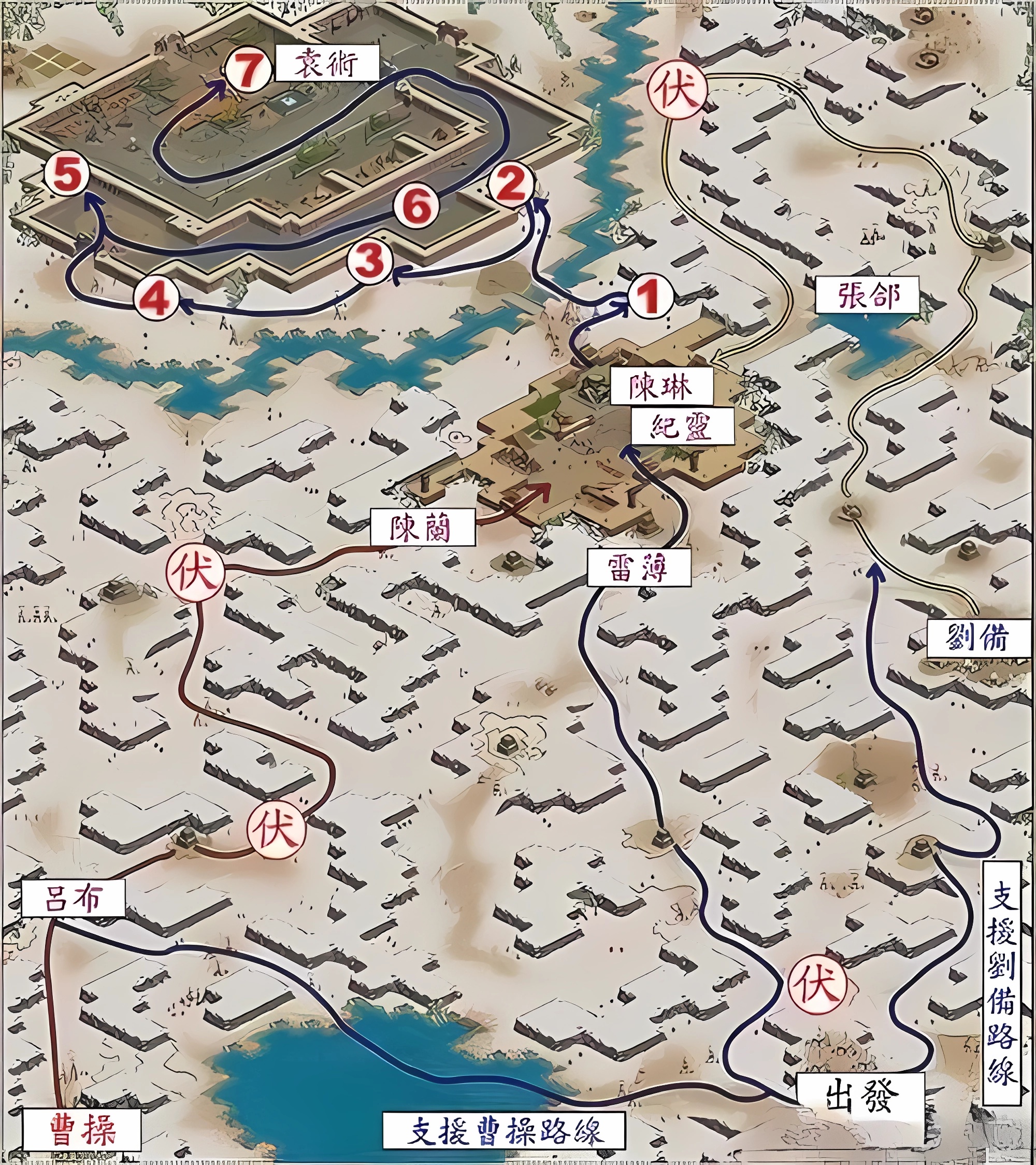 攻略顺序:本关要援助曹操。在战争开始之后不多久,就会有谋士说曹操需要援助,所以若在一开始的时候前去支持曹操,就可以赶上他跟吕布的一场大战。如果放着不帮,曹操一定会被吕布灭掉。安排最强的部队使用疾行立刻前往吕布处,然后在吕布出现的时候放技相助,就可以很实际的击退吕布。之后该部队沿着曹操会经过的路线向上抢攻,将中央营前的陈兰击毙,曹操便不会有大碍。帮助曹操之后在中央会合。中央的大帐里面有一军寨,寨中尚有陈琳与纪灵两将,此帐下方还有个雷薄,打下此处之后,往上打下兵哨,然后将堵在桥上的敌人清光,次第往三个兵哨进袭,之后进入城内,穿过一长廊之后可以往上进击,但是不要轻举妄动,先在其左右四周晃晃,将该处敌军小兵引出,打死之后再冲入,一口气解决袁术。