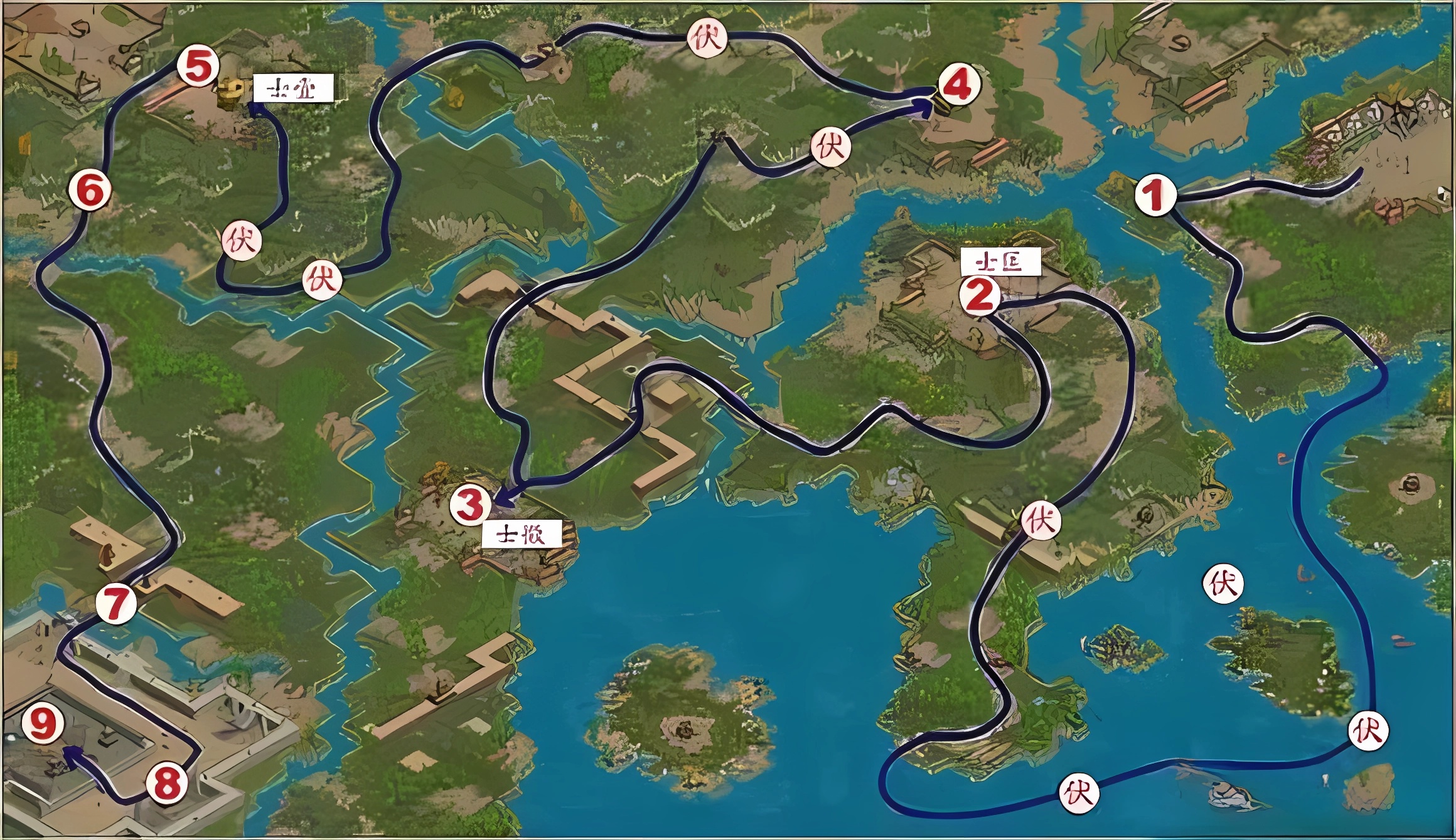 攻略顺序:从开始处编队,编好之后,往下走出海以后继续向下走到右下角,该处有伏兵。解决该处伏兵之后转向左,可碰士只。将士只打退之后,上陆进入城门,军寨是士匡,抢下该处军寨之后可以进行回复和补给。记得将本阵的人带来此处镇守。向左过门,可以见到士徽,打完士徽之后,也要记得留兵在此处。将刚刚这两处军寨守好,就可以继续向上发兵,顺序打下两处,士壹并不很强,打完后山越援军前来攻打之前两处军寨,立刻转去进行防守。守下来之后才继续发进。城外的的两座箭塔根本不要打,用疾行快速冲过就可以了,冲入城内先打兵哨,然后在该处勾引士燮出战,将士燮干掉之后再上去扫平兵哨,最后进占城中,任务完成。