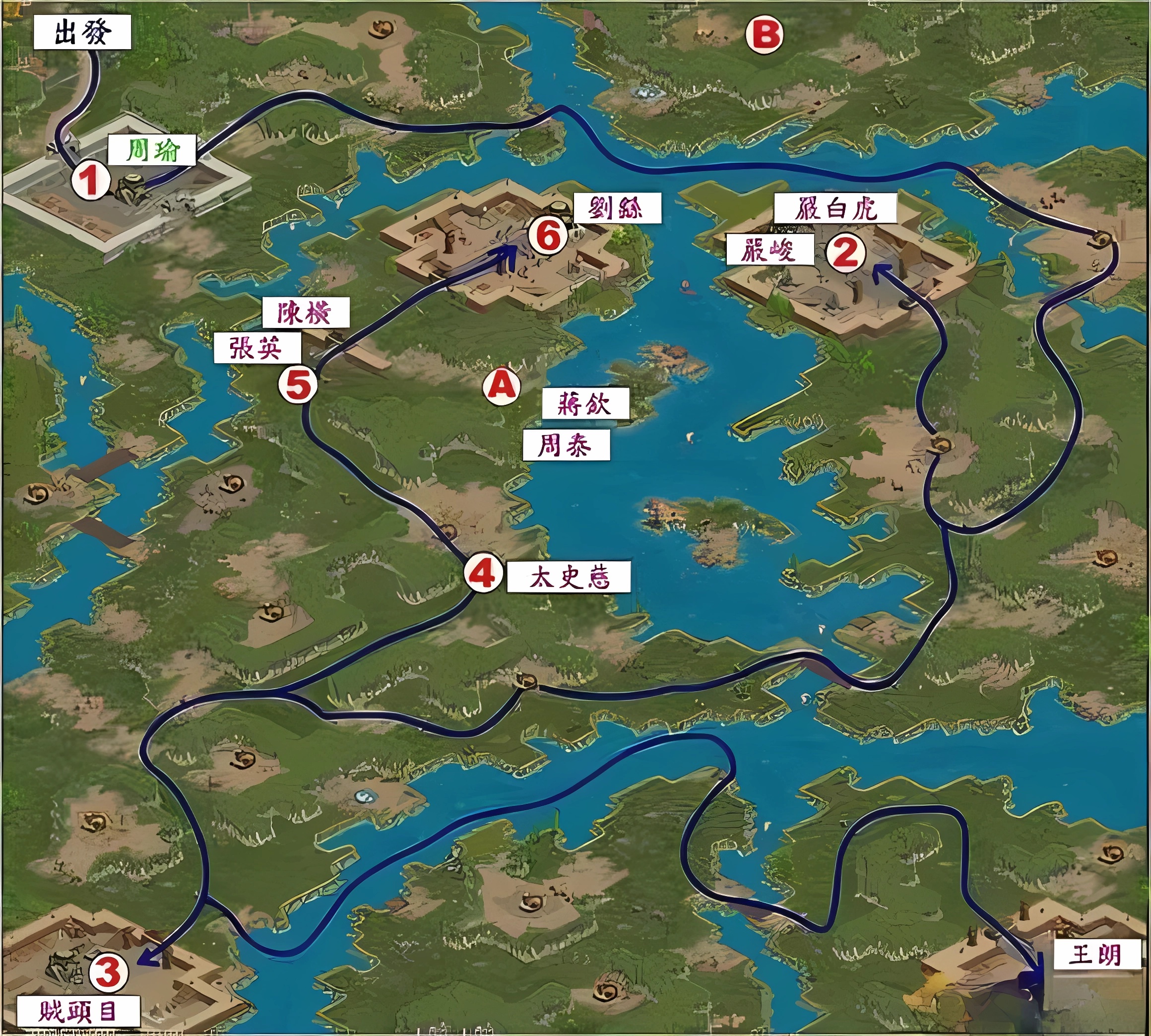 攻略顺序:从出发处往右走,两人都可以出寨门。走出此处后往右上走去,从大岛处上岸,然后往左可以碰见韩当伏兵。将韩当打倒之后可以收伏他,但是他并不会加入。之后往上避开山寨,然后打倒守军,救出黄盖。黄盖加入之后才去打山寨,打完山寨之后出海往右走到底,打倒守军之后可以就出程普。四人一起之后,可以扫荡一些兵哨站,从中取得一些战利品,之后可以往右上打山寨中的贼头目,打倒头目之后本关就会结束。