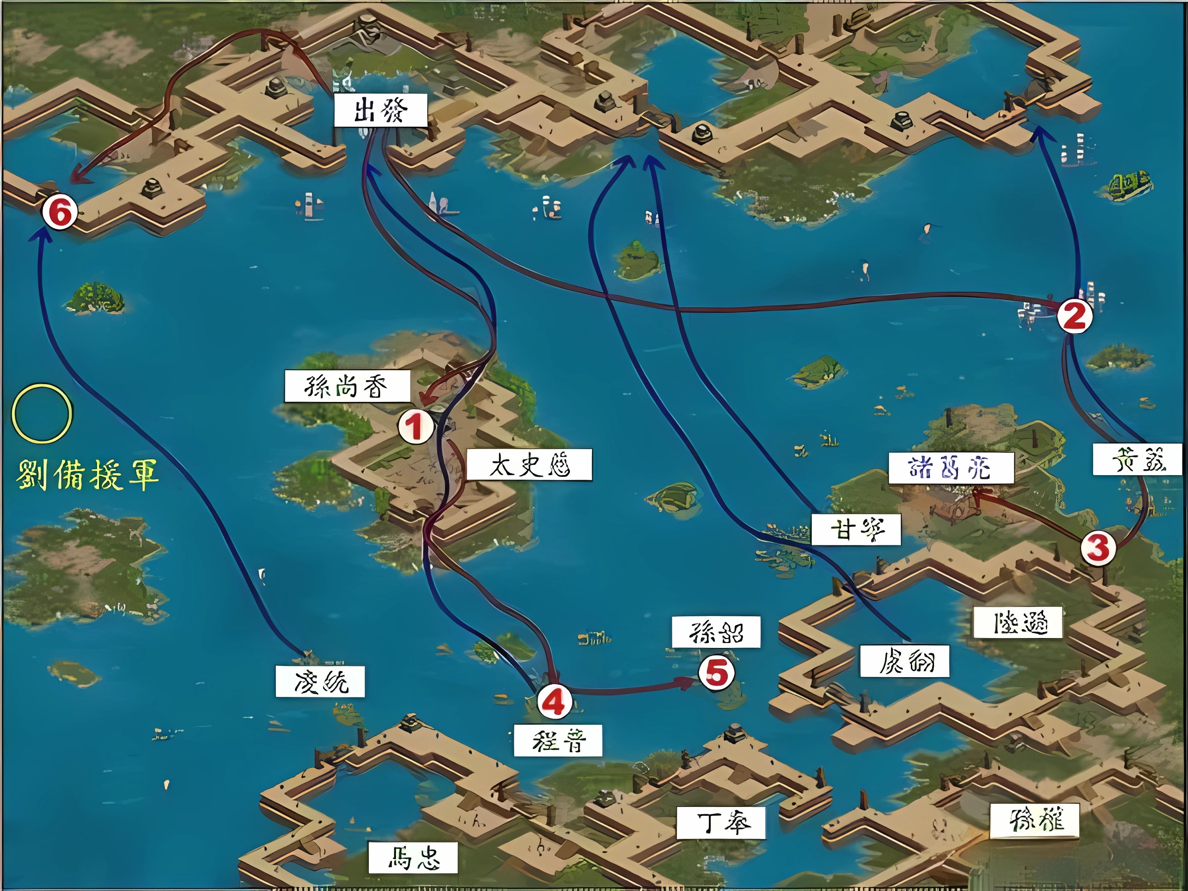 攻略顺序:从开始处要先进兵到右侧支持战事,与陆逊、黄盖等将作战。并从此处登陆上去擒诸葛亮。将诸葛亮擒杀之后,动兵去打河中岛的军寨。首先对战的是孙尚香,攻下(1)处军寨之后,太史慈会从下面打上来,将太史慈打跑之后,派少数人去守城,其余人往下接战程普和孙韶。右侧的虞翻、甘宁二将,亦会来袭我军右二门。如果打下程普和孙韶的话,就快速回防右二门,如果打不下也无所谓,让他们慢慢去攻中央岛,我军最强部队一定要守住此门。火计失败之后,再回头收拾已经深入的甘宁等人。这时候他们均已上路,形同瓮中捉鳖,只要配合主寨加上最强军队的包夹就会死掉。之后会出现刘备援兵,他们会从左侧进入画面,等到消灭这支援军之后,吴军就会呈现无法进攻的姿态,那时候就从左边开始慢慢打,一路打到右边就可以过关了。