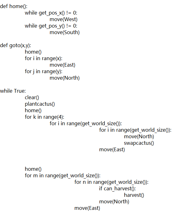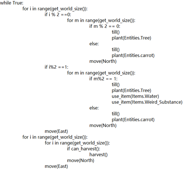 编程农场(The Farmer Was Replaced)是一款融入编程玩法的模拟经营游戏,玩家需要使用类Python语言对无人机进行编程,之后点击执行,就能让无人机进行收割等操作,实现农场自动化。游戏采用渐进式曲线成长机制,玩家需通过简单编程收割作物获取资金,然后解锁列表、字典等变量以及语法,以便于从简单循环指令实现单块农田播种,到编写复杂算法应对多作物混种,玩家可随着游戏进度逐渐掌握编程逻辑。编程农场游戏支持还VS Code等外部代码编辑器进行创作,玩家可通过文件监视器同步至游戏中,方便玩家在自己熟悉的环境中进行代码编写。