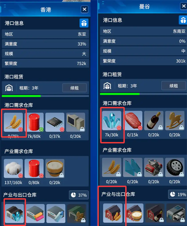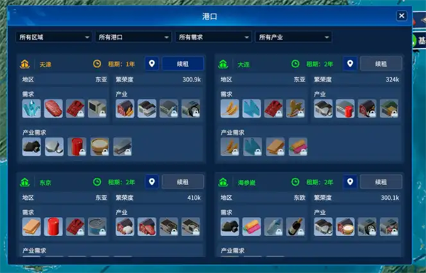 游戏有港口产出、港口需求和产业需求三种视图切换,更方便地查看各个港口港口的供需情况。点击某一货物,即可查看紧缺该货物的城市。本质上,这是款和面模拟器。货多加船加增运速,货缺加港口增市占率。