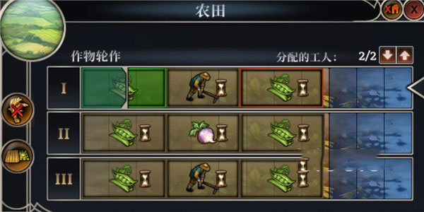 4、农民在游戏内非常有限,在特殊情况下可调配农民来应急。后期玩家想要扩大农田的话,只能在原有农田的基础上往四周扩散,同时收成增加了,玩家别忘了多修建地胶来储存蔬菜。