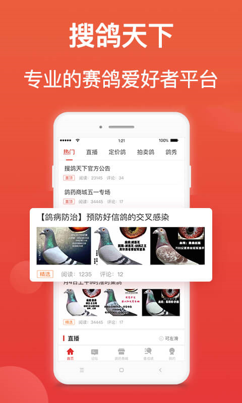 搜鸽天下App内实时进行赛事直播,及时更新比赛数据,用户可查看每场比赛的奖金数据、成绩以及指定项数据,了解最新状况。搜鸽天下还是一个鸽子交易平台,提供定价鸽和拍卖鸽两板块,用户可以在此挑选喜欢的鸽种,开始自己的养鸽之路!