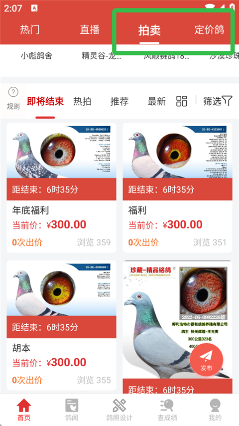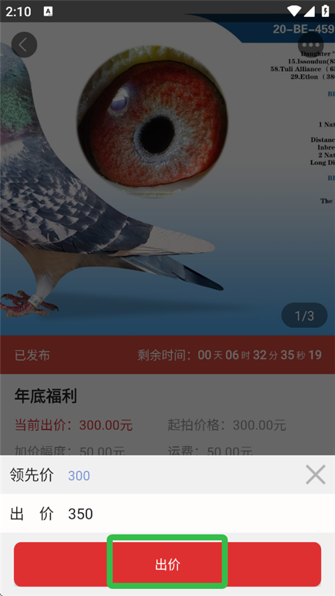 4、挑选喜欢的鸽子,点击【我要竞拍】,点击【出价】,竞拍成功后将会自动生成订单。