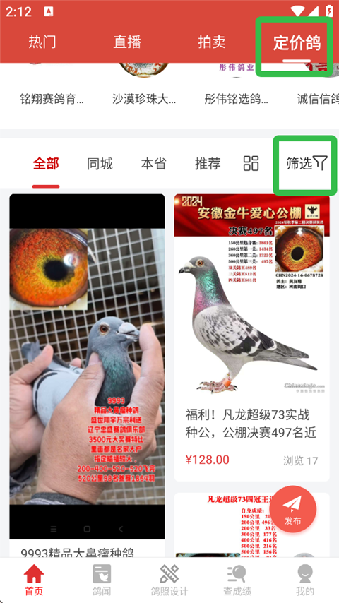 5、若购买定价鸽,在定价鸽界面同样点击【筛选】,设置购买条件。