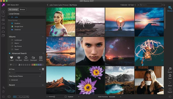 Resize 2023具有ON1 Photo RAW的原始处理引擎。当您浏览,预览和调整原始照片的大小时,此强大的引擎可为您提供逼真的色彩和细节。