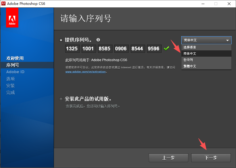 3、复制序列号【1325-1001-8585-0906-8544-9596】进行输入,右上角选择语言;