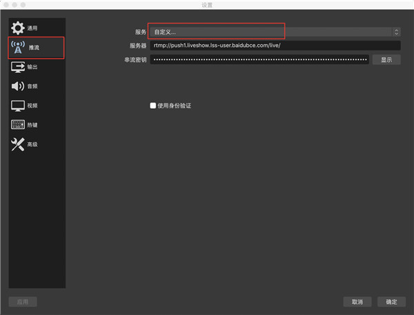 4、在弹出窗口中依次点击左侧【推流】,右侧『服务』选择「自定义」