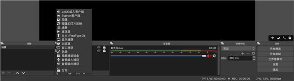 7、在OBS主界面,默认下方有场景和来源模块,您可以根据实际直播内容选择添加不同的素材以实现直播间的多样化配置和场景切换。