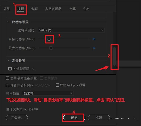 6、下拉右侧滑块,滑动“目标比特率”滑块到具体数值,点击“确认”按钮;