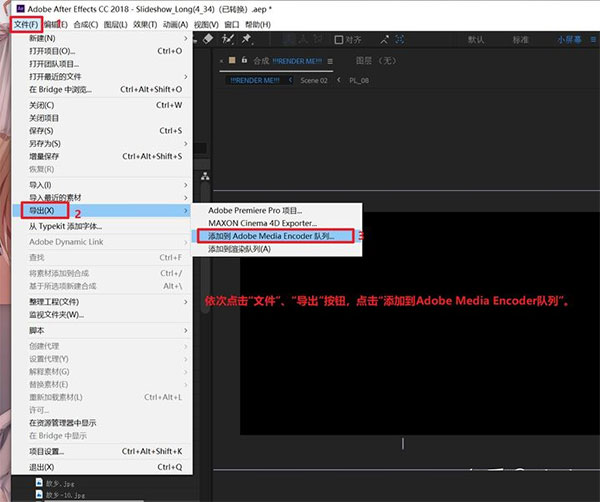 1、依次点击“文件”、“导出”按钮,点击“添加到Adobe Media Encoder队列”;