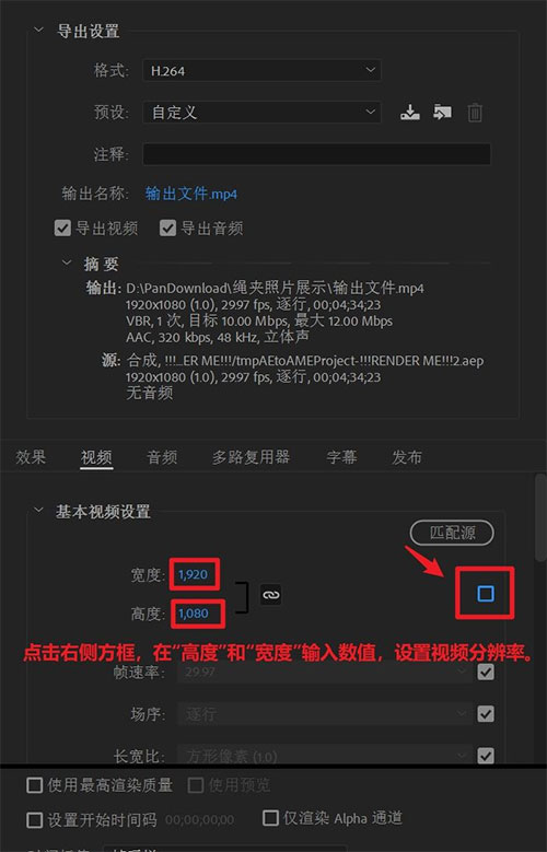 5、点击右侧方框,在“高度”和“宽度”输入数值,设置视频分辨率;