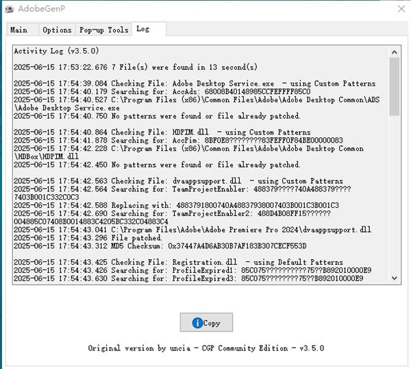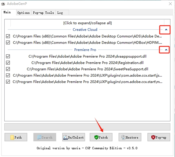 6、点击Search,等待一下后,点击右上角,一定要看到Adobe Premiere Pro 2024版本,随后点击Patch;