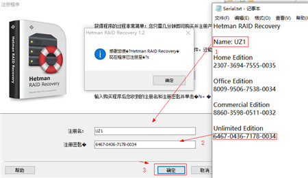 将对应名称和注册码复制填入激活框,点击确定即可