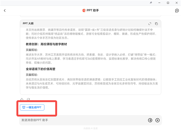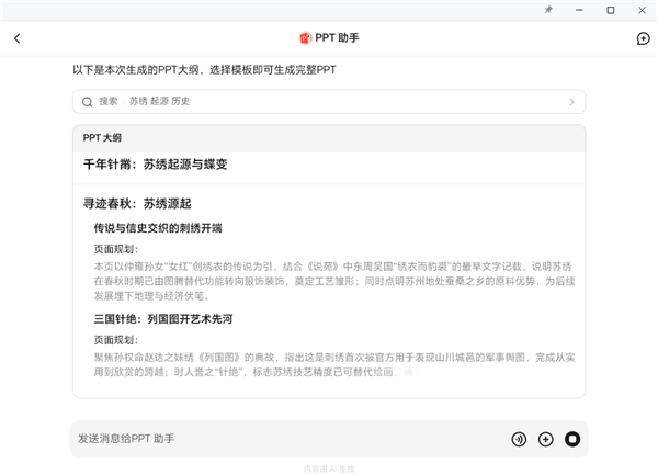 3、在输入框中简要描述自己的需求,如【以“苏绣的起源与发展”为主题,生成一份PPT。】。