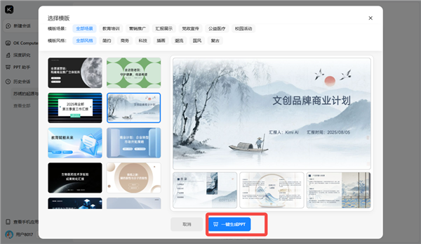 5、等到Kimi生成好后,查看大纲有无需要修改的地方,可以随时调整。然后就是选择PPT的模板了,点击【一键生成PPT】。