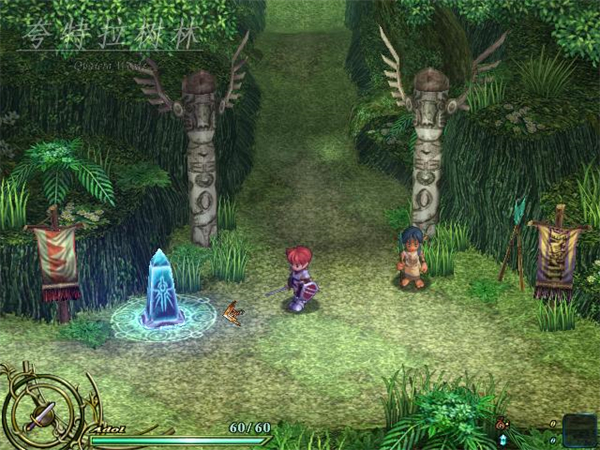 step4.外出村庄,在森林进入村庄的路口左侧可以发现一颗水晶石的石碑,这颗精灵石碑可以供亚特鲁保存游戏,以及恢复其血量。