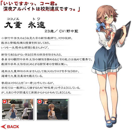看上去像小个子中学生的新任教师,洸的表姐。在学校负责教授数学和情报处理科目,是一直投入全身心工作的努力型。虽然是新任教师但是突然就担任了高二年的教师,作为学校委员会的顾问和高二年段长辅助也展现出了极端优秀的能力,以教导主任和段长为首的许多人都对其很是信任。周末作为九重神社的巫女给祖父宗介帮忙的同时也在道场担任九重流柔术的教练。