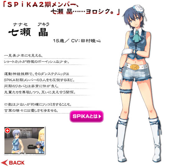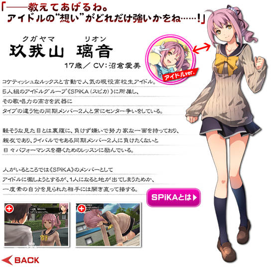 “SPiKA”初期成员的其中一人,与璃音在养成学校时就认识。自尊心强,不论对自己还是别人都非常严格,演唱会也追求必须圆满完成的主义者。在组合成员中身高最高,出众的样貌和身材使其在模特界也相当有名,不但有许多男性粉丝,在年轻女性人群中的人气也非常高。根据其粉丝得到的情报看,她似乎很喜欢卡牌游戏同时也是这类游戏的强力玩家……