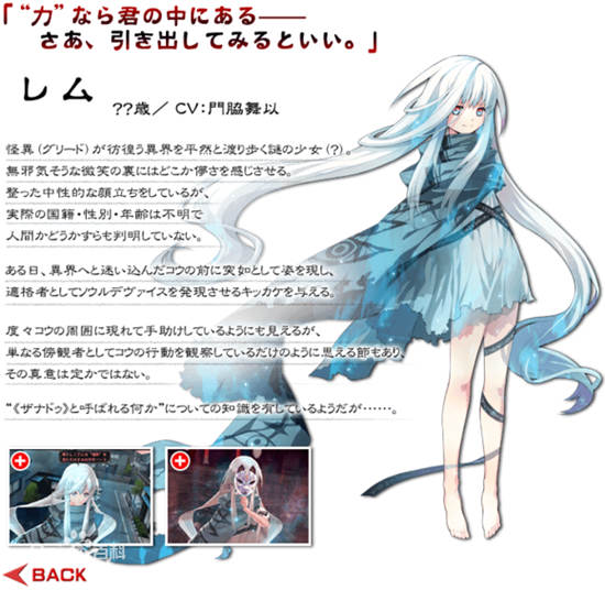 可以在“怪异”到处彷徨的异界若无其事地行走的迷之少女(?),在天真无邪的微笑背后会使人有身处梦境的感觉。虽然有端正的中性面容,但是实际上国籍、性别、年龄都不明,连其到底是不是人也无法判断。那一天,蕾姆突然出现在误入异界的洸面前,给了他发现灵魂装置并成为“适格者”的契机。时常在洸周围现身并帮助他,有时又只是作为一个“旁观者”观察洸的行动,故无法确定她的真实意图。似乎了解“xanadu”一词所指代的真实意义…...